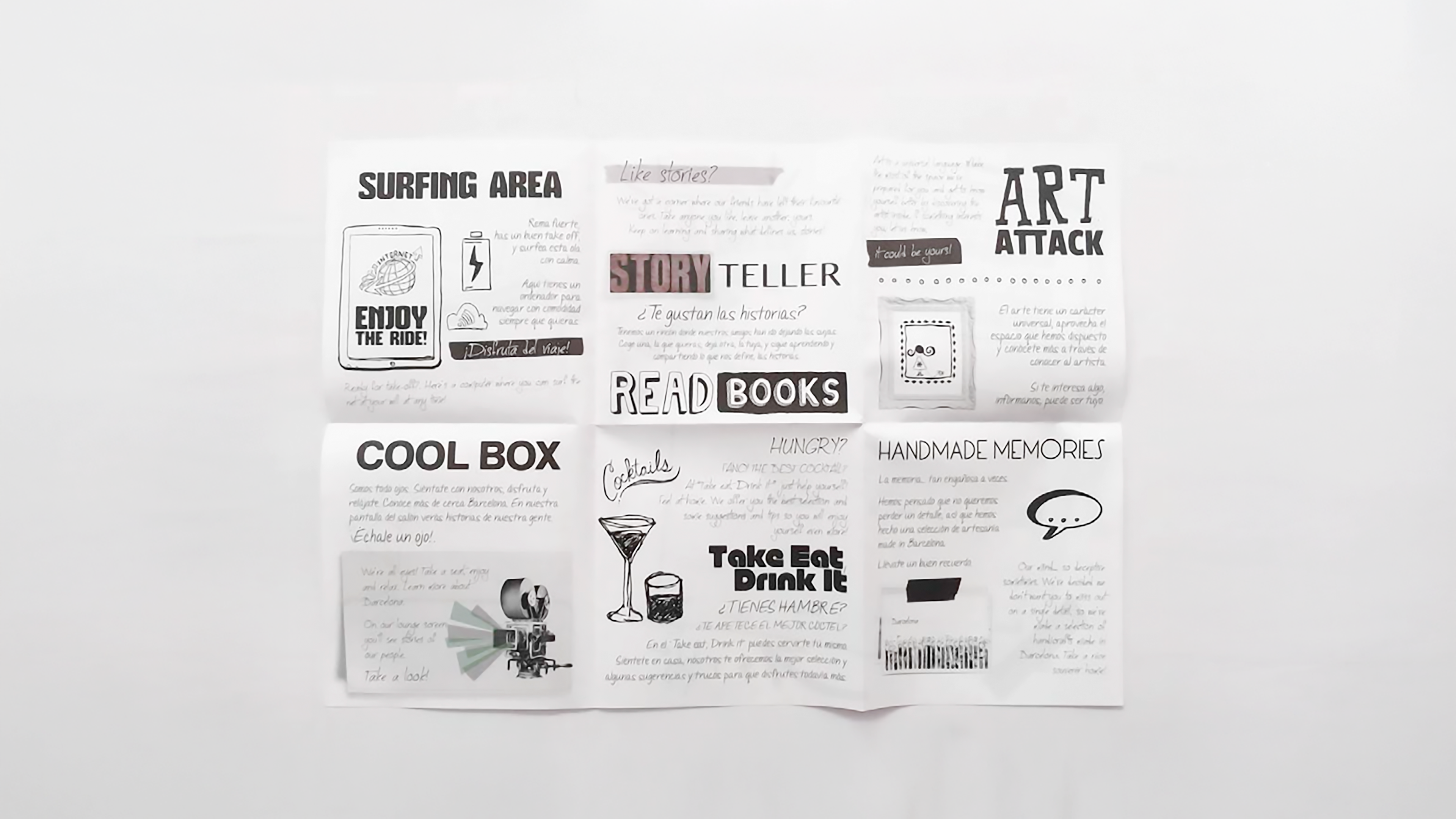 Las aplicaciones de marca abarcaron desde papelería básica y señalética hasta elementos especiales como amenities, uniformes, colgadores de puertas, carteles de zonas comunes y piezas digitales (web, redes sociales, e mailing, newsletters). Una de las piezas más destacadas fue el Sketchbook, una guía de Barcelona diseñada como cuaderno de viaje ilustrado, con anécdotas y recomendaciones escritas en primera persona por los protagonistas. Este objeto se convirtió en una extensión de la narrativa del hotel, reforzando la sensación de autenticidad.