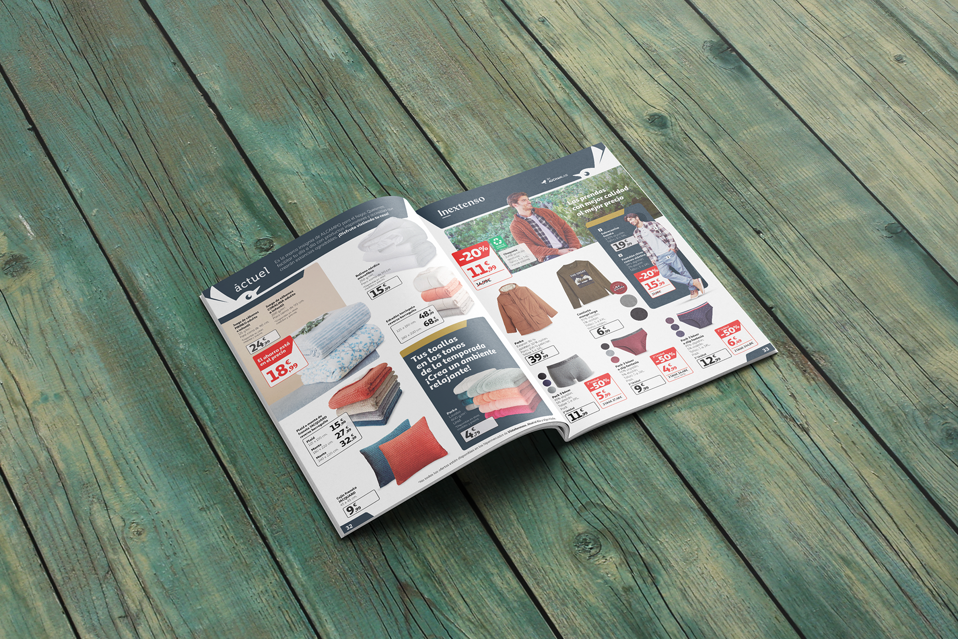La propuesta se construyó como una sinfonía visual de orden y cohesión. El diseño se basó en formas básicas y especialmente en el rectángulo con esquinas redondeadas, aportando familiaridad y consistencia gráfica. El uso del rojo para alimentación y azul para textiles ayudó a segmentar categorías de manera clara, mientras que la alineación a la izquierda de los precios reforzó la legibilidad. Las cajas de promoción destacaban ofertas de forma elegante y fluida, guiando al cliente de manera intuitiva. El resultado fue un folleto con una identidad visual sólida, clara y moderna, que invitaba a explorar las ofertas de Alcampo con confianza y sencillez.