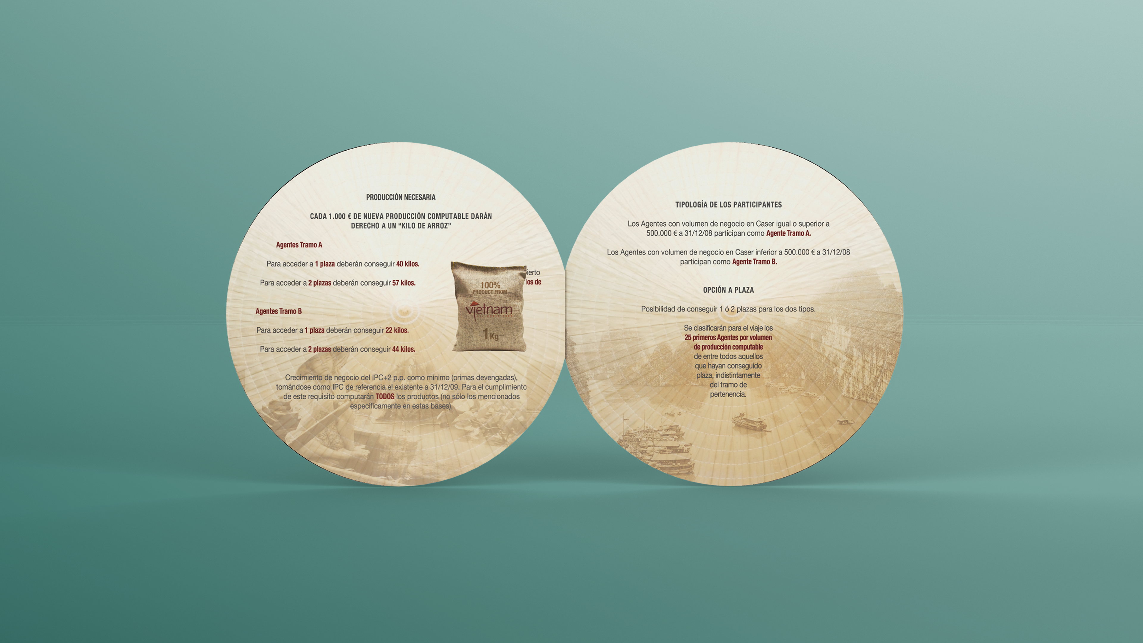 Al abrir la caja, lo primero que se encontraba era un tarjetón de bienvenida, que daba paso al universo visual de la promoción. La caja, pensada también como un objeto decorativo para la cocina, venía parcialmente llena de arroz real y podía ir completándose con sacos de arroz personalizados, que representaban los puntos acumulados en función del tipo de póliza vendida. La idea de acumular puntos mediante sacos de arroz permitía un sistema sencillo, visual y fácil de comprender, que se vinculaba directamente con la cultura del destino del viaje.