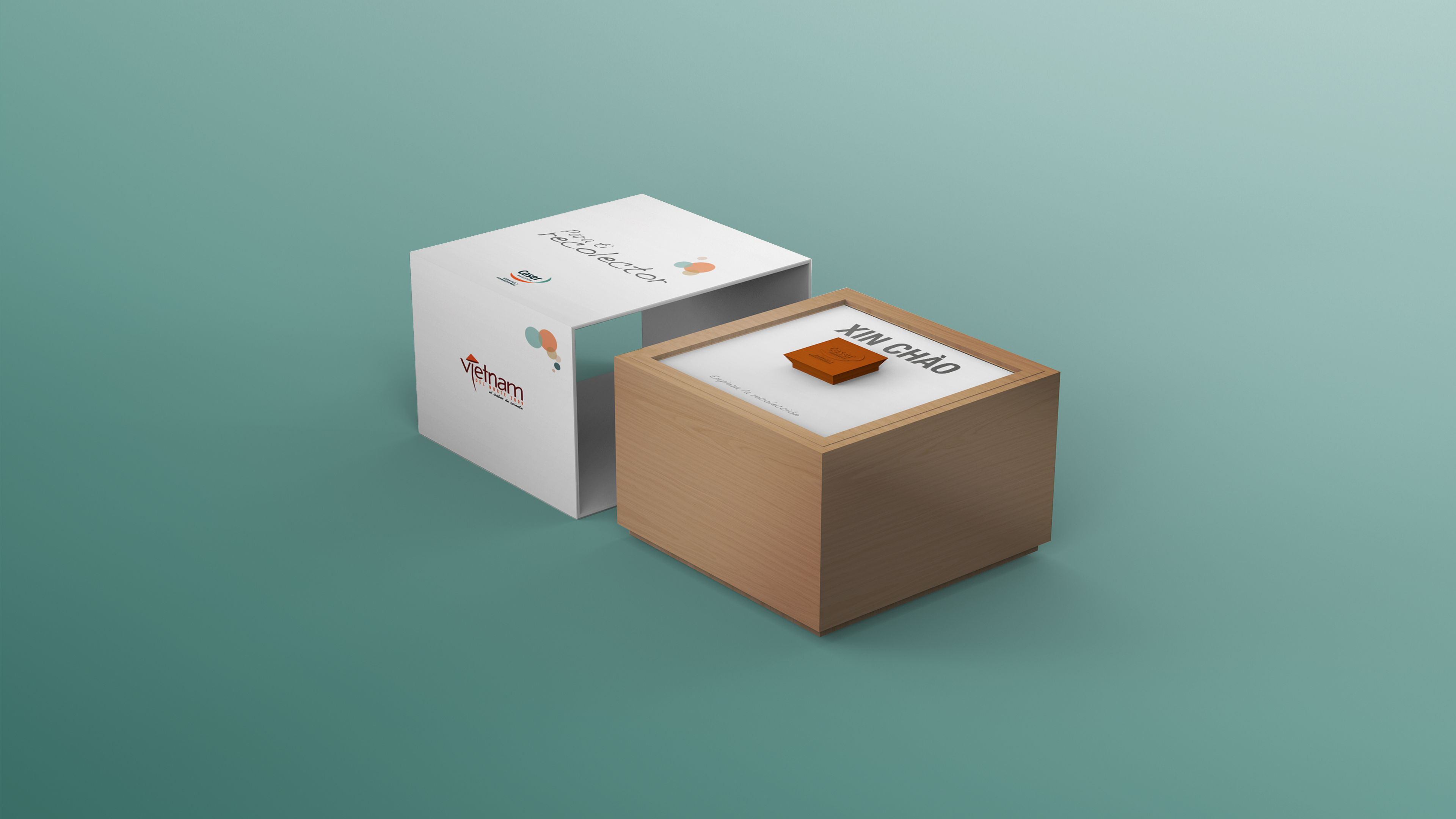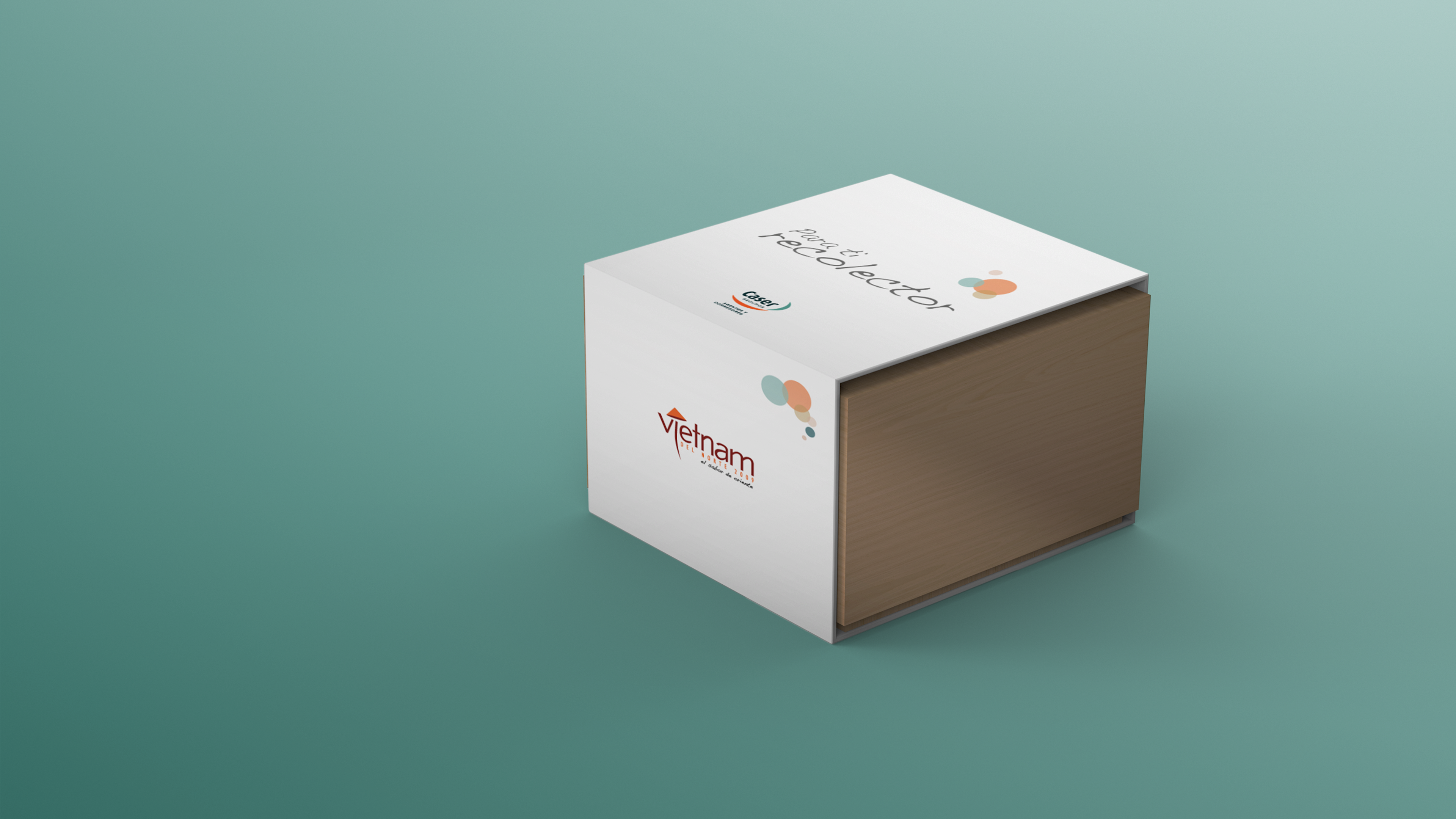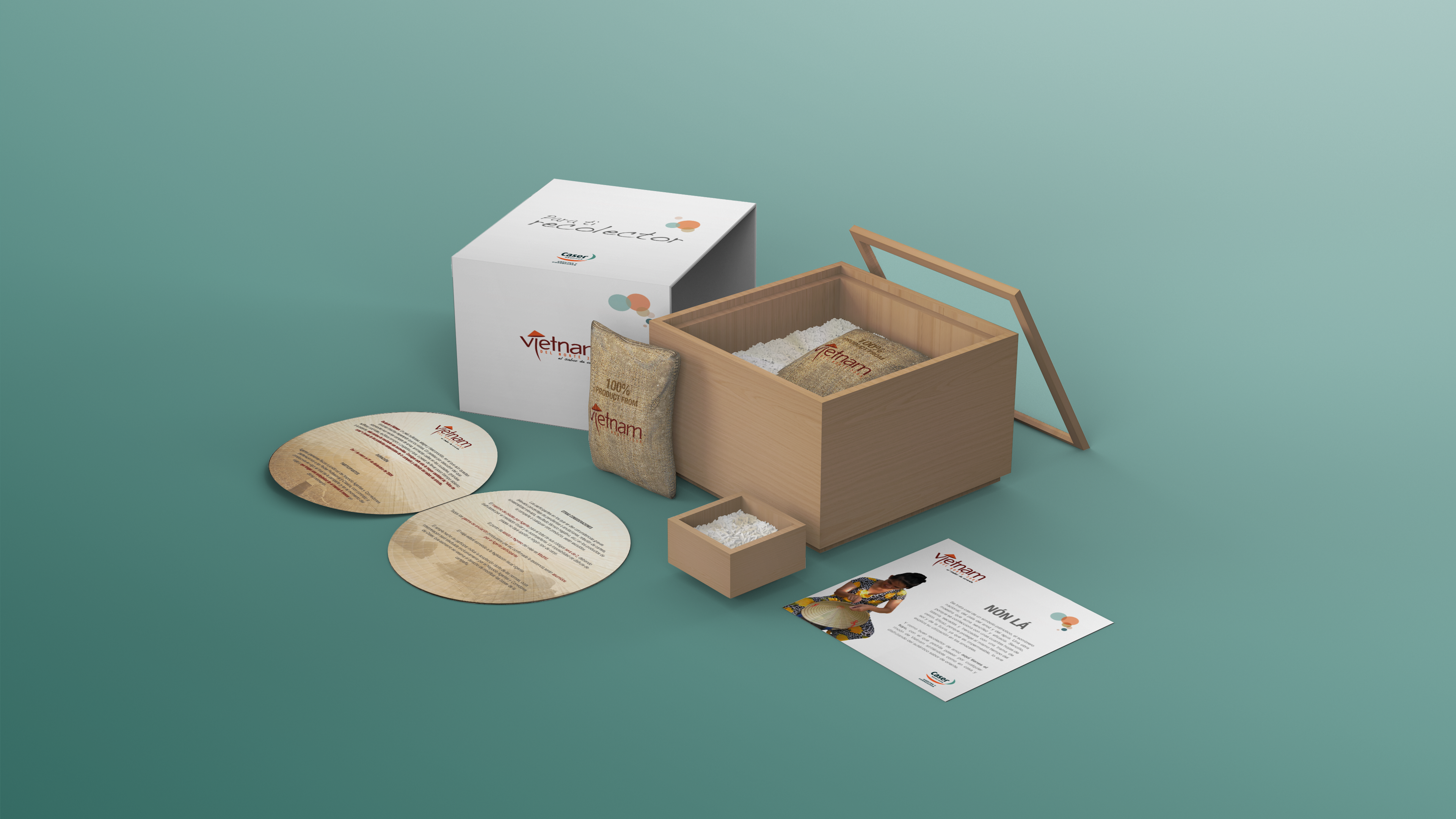 Se diseñó un mailing muy especial: una caja de madera que contenía todos los elementos necesarios para activar la campaña y captar la atención de los agentes desde el primer momento. El elemento central era un programa con la forma de un Nón Lá (el icónico sombrero vietnamita), que explicaba la dinámica, los premios y las condiciones de participación.