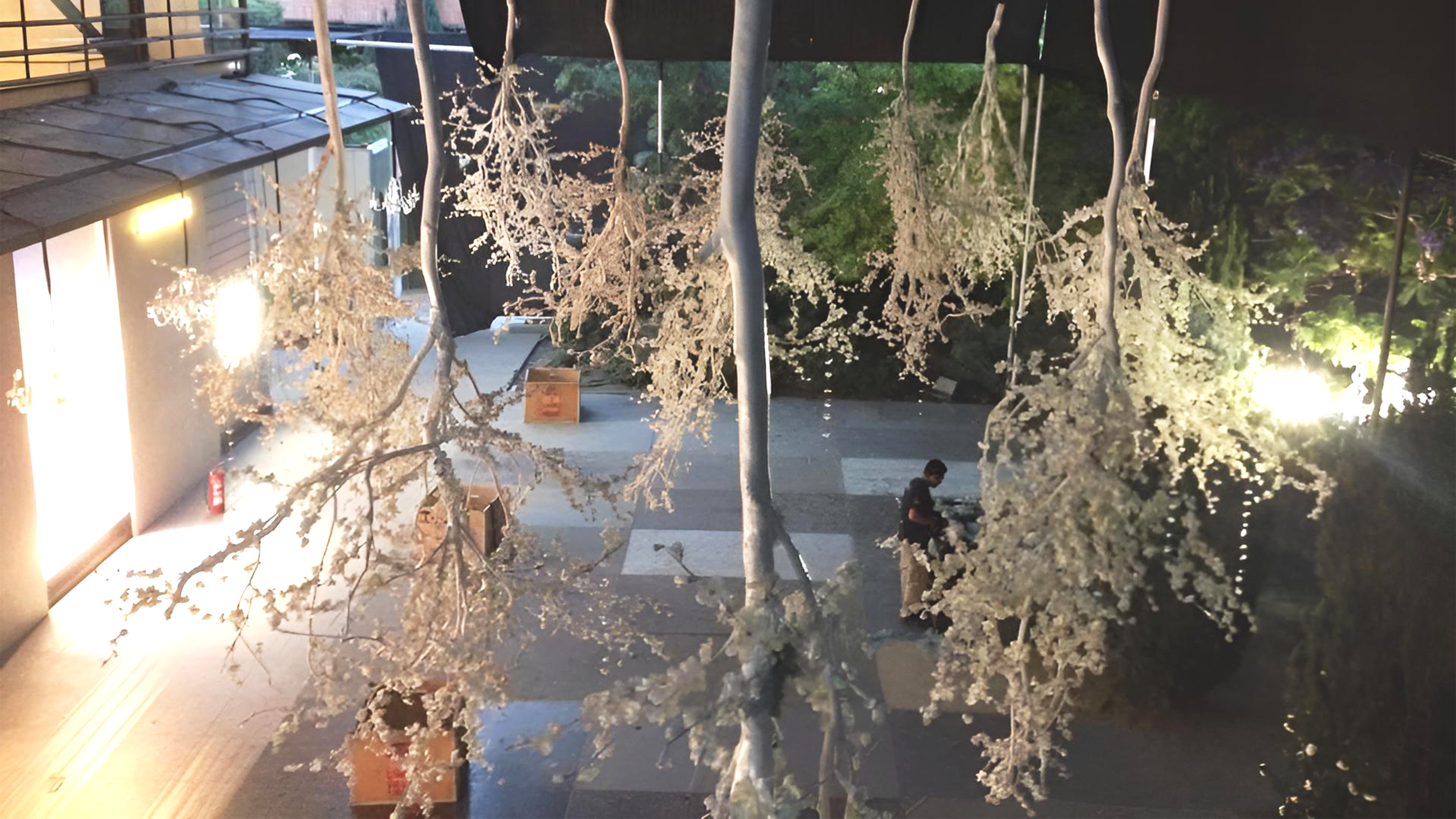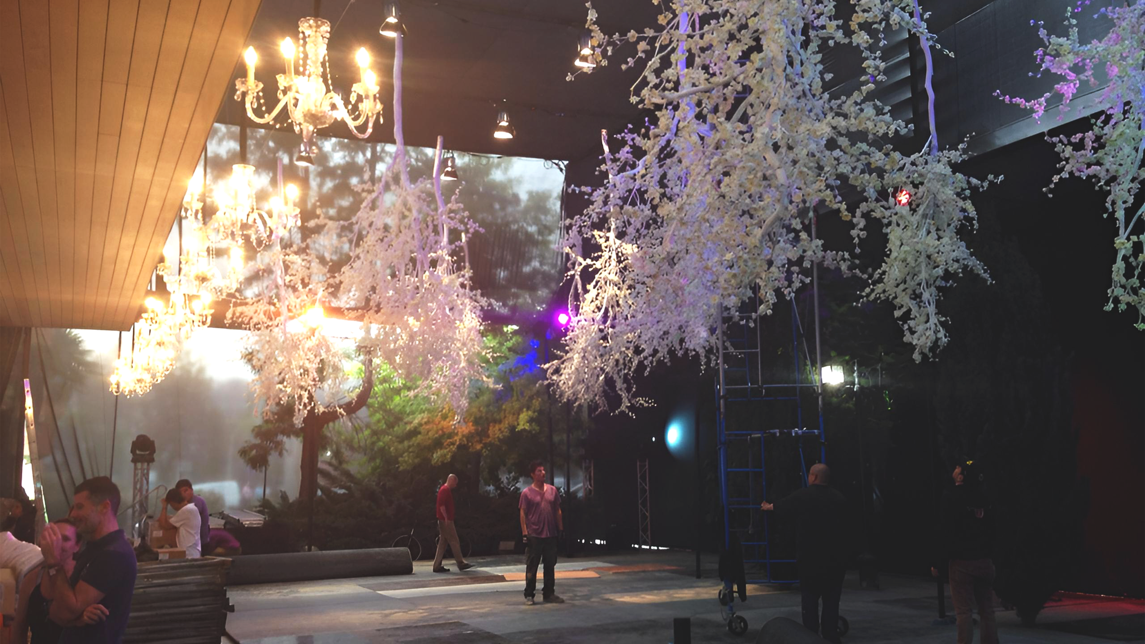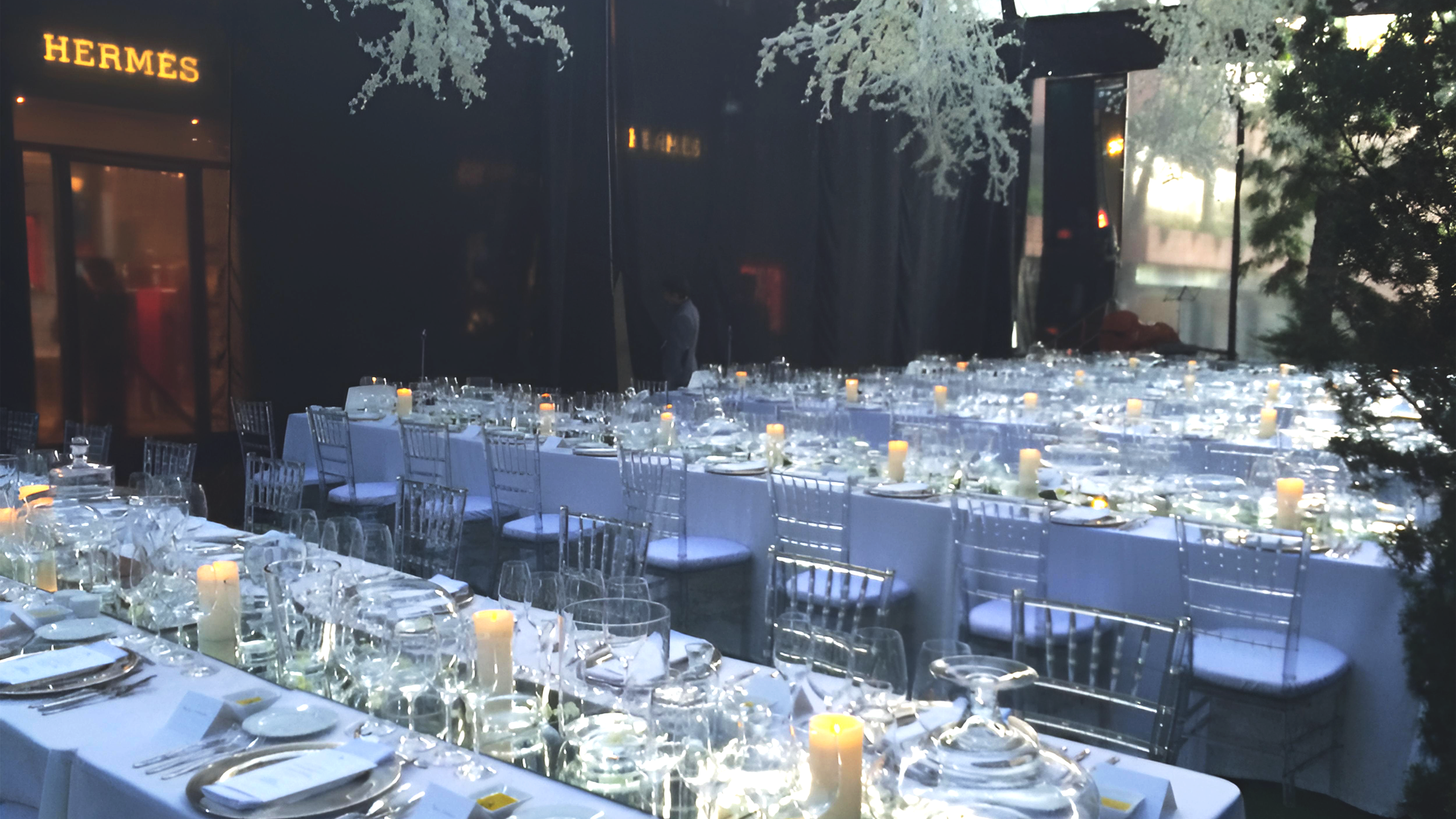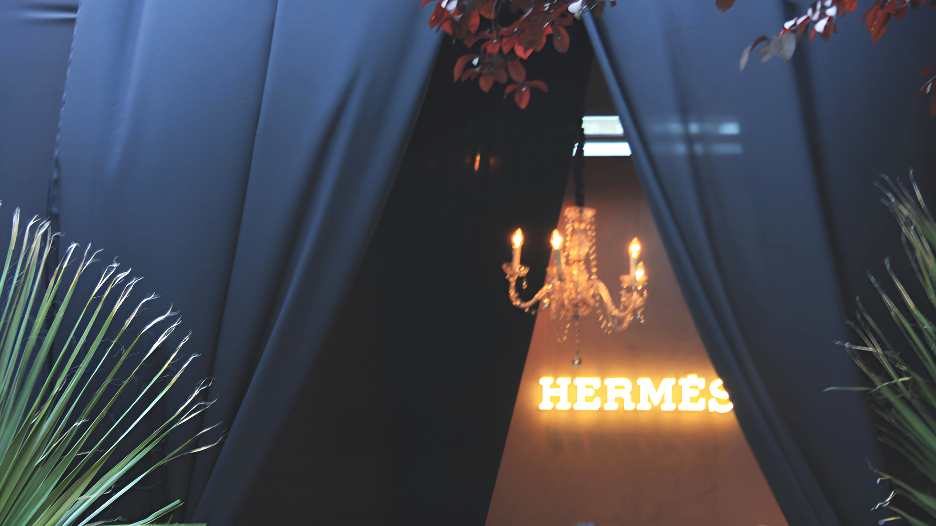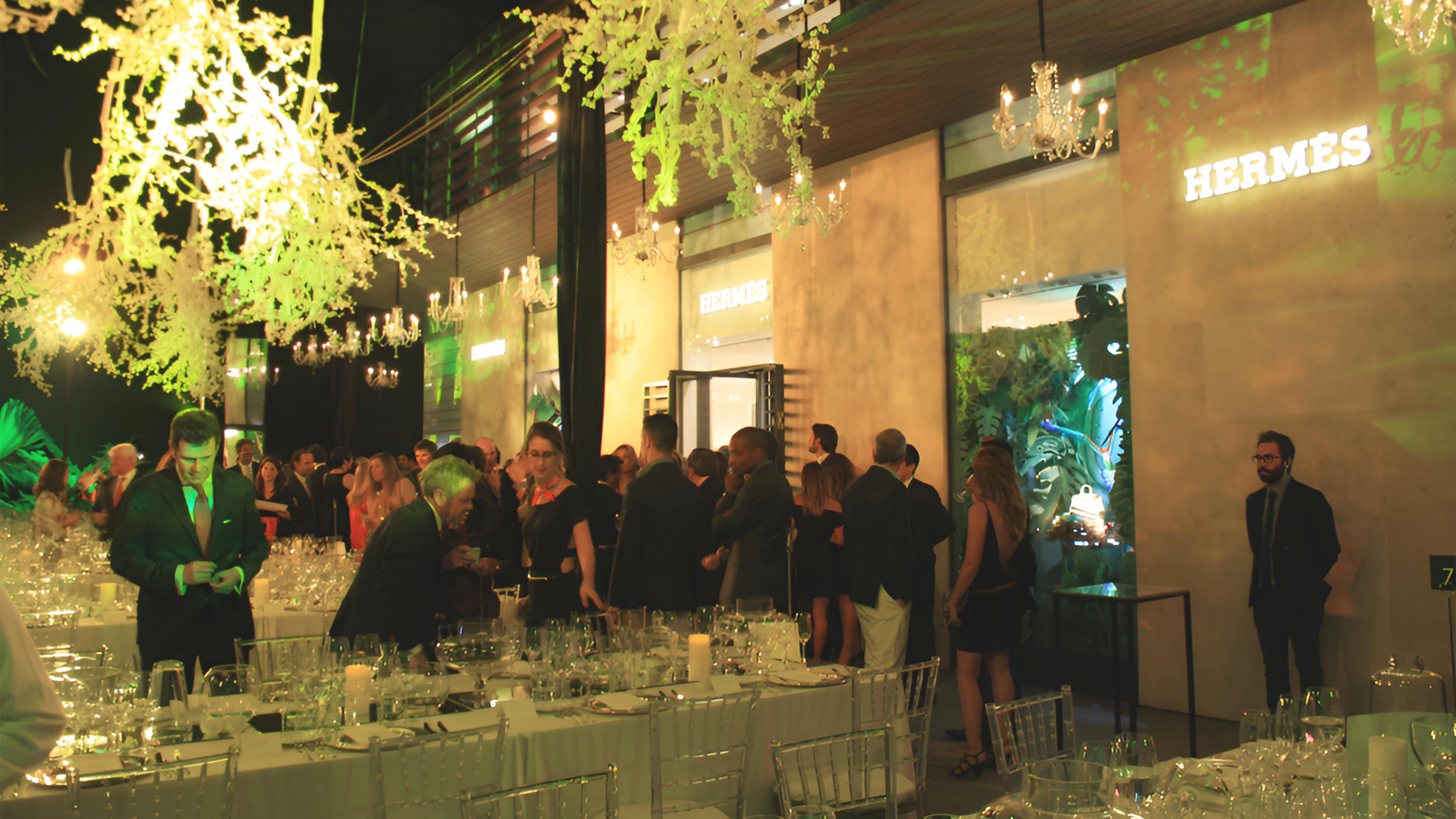 La ambientación se inspiró en la naturaleza y la transformación: árboles gigantes, plantas, iluminación, efectos sonoros y decoración que recreaban un entorno natural, intercalado con producto. Cada detalle buscaba sumergir a los invitados en la narrativa de transformación y lujo creativo que caracteriza a Hermès. Se desarrolló un concepto visual y experiencial inspirado en la campaña de 2014, donde los productos se integran en la naturaleza de manera creativa, con iluminación y efectos sonoros que reforzaban la sensación de entorno mágico y natural. Catering conceptual, alineado con la idea de transformación.