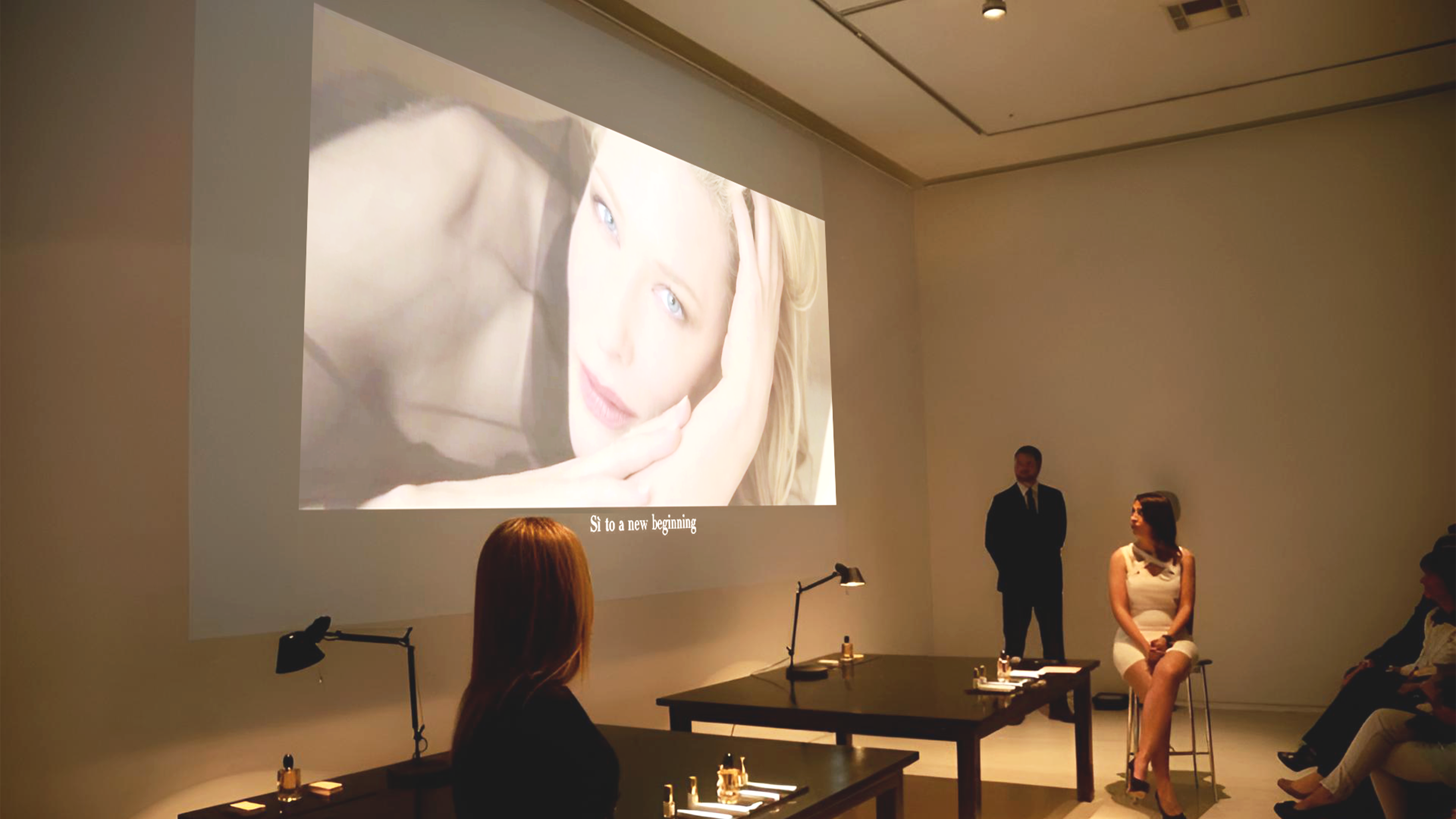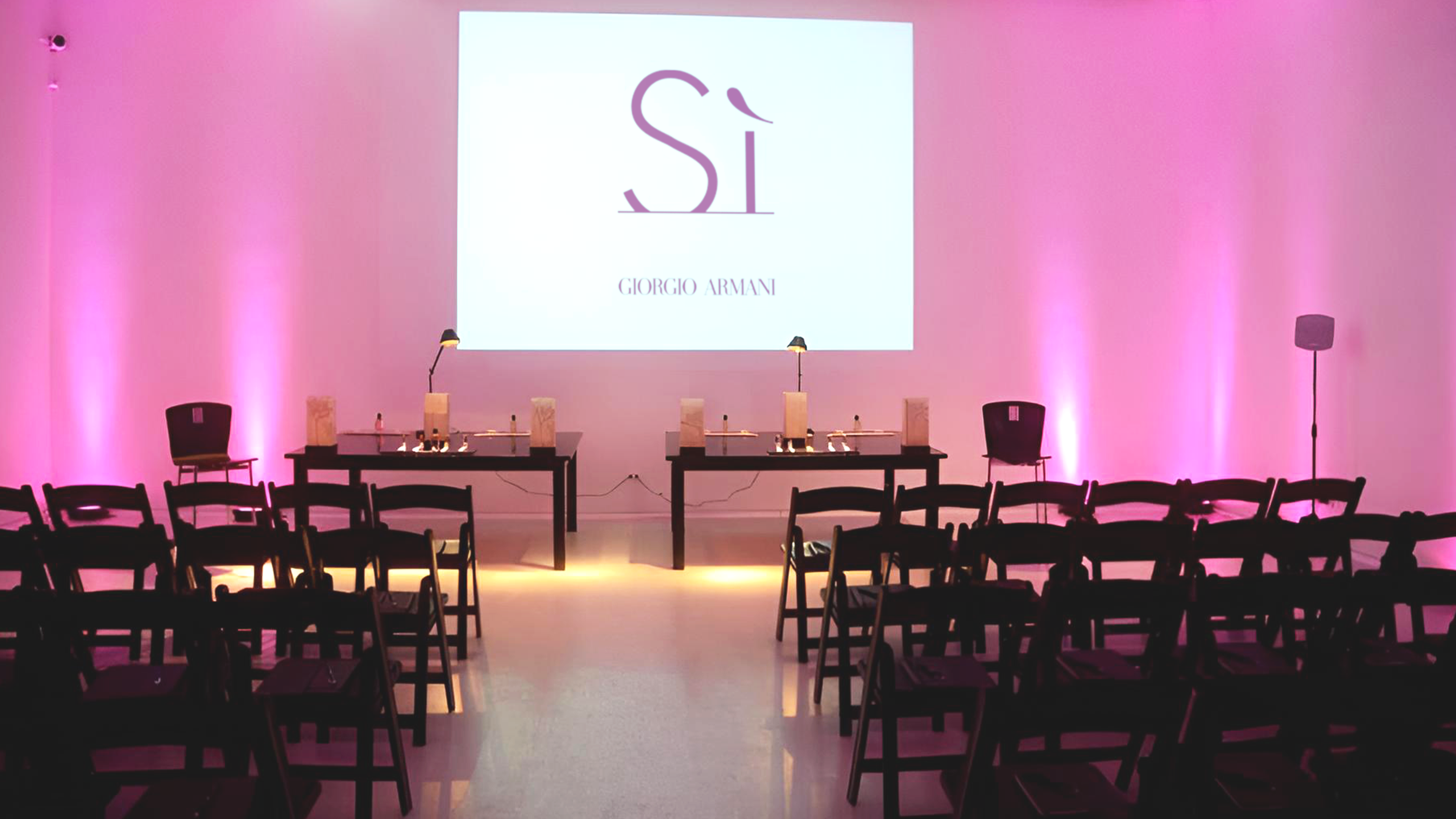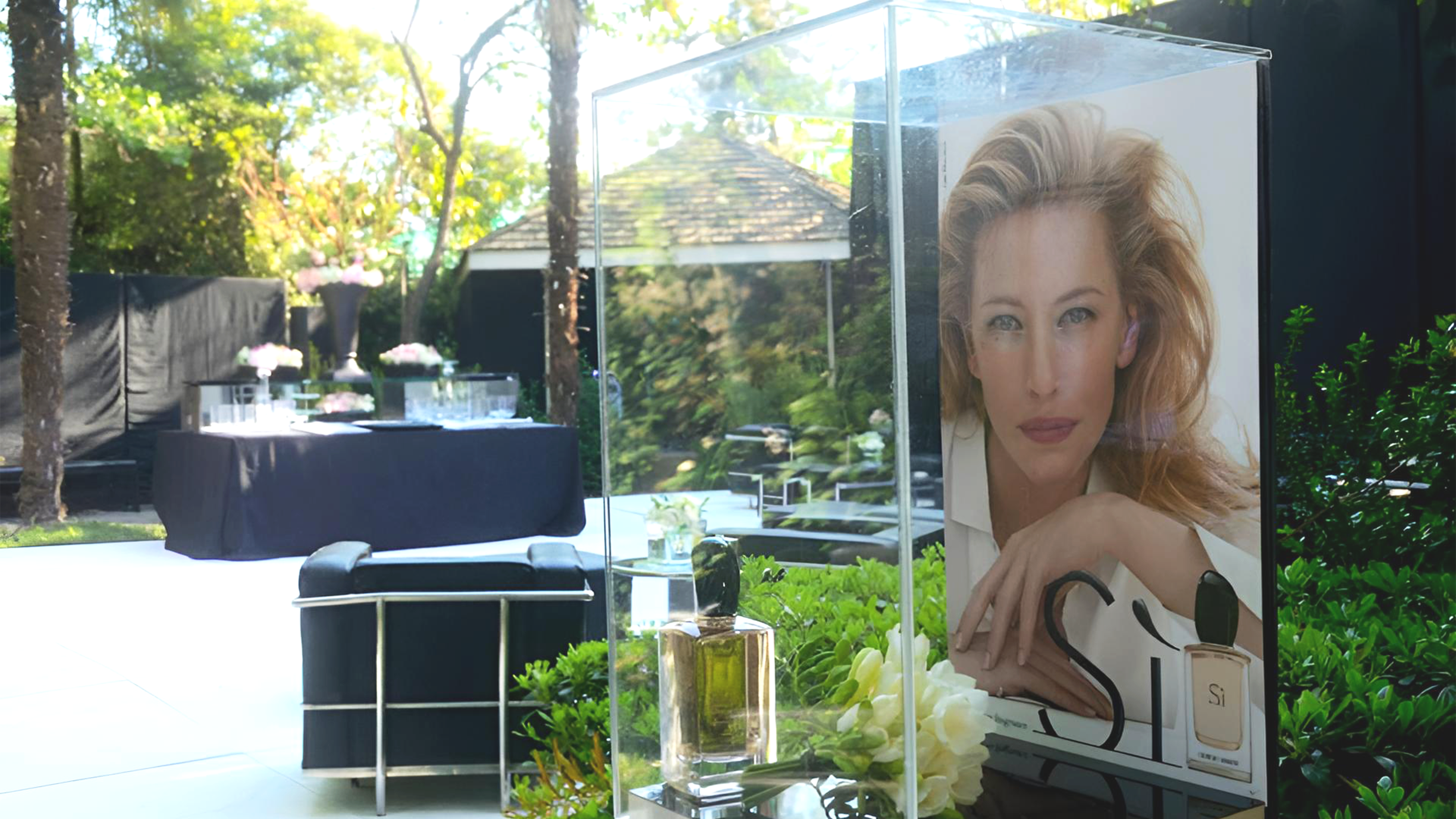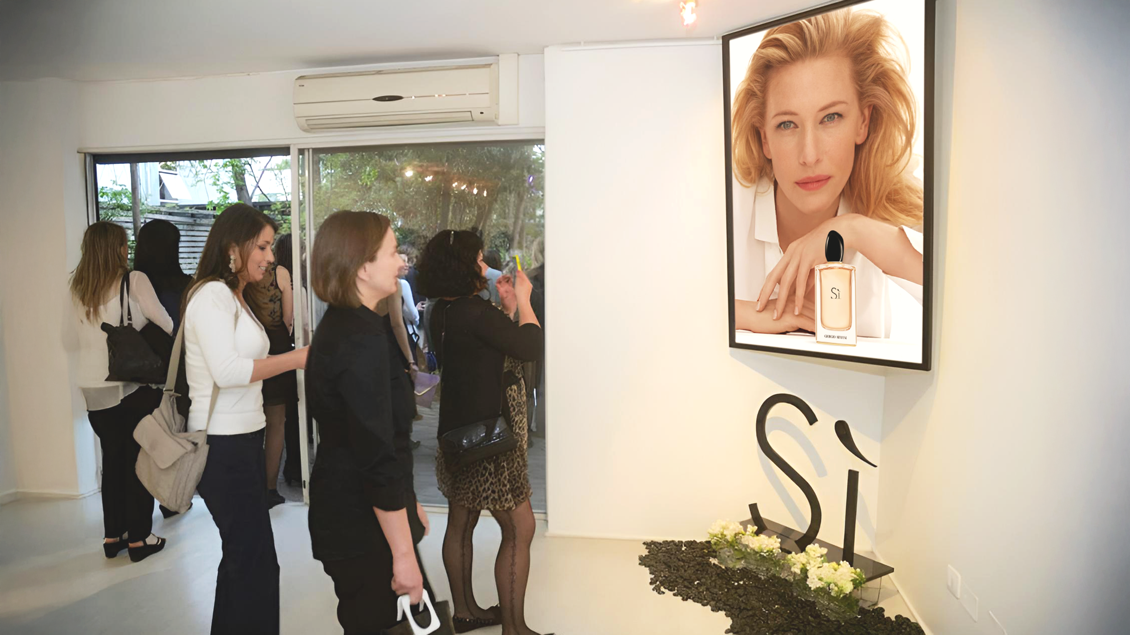 El evento se concibió como una experiencia elegante y sensorial que trasladaba el universo de Sì al espacio físico, respetando el look & feel minimalista y sofisticado de Giorgio Armani. La ambientación se inspiró en las notas olfativas de la fragancia, utilizando una paleta de blancos y beige pálidos, flores delicadas y jarrones de cristal transparente y negro, creando un entorno luminoso, femenino y atemporal.